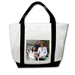 onto a 20x13x5" canvas tote bag with navy blue handles.